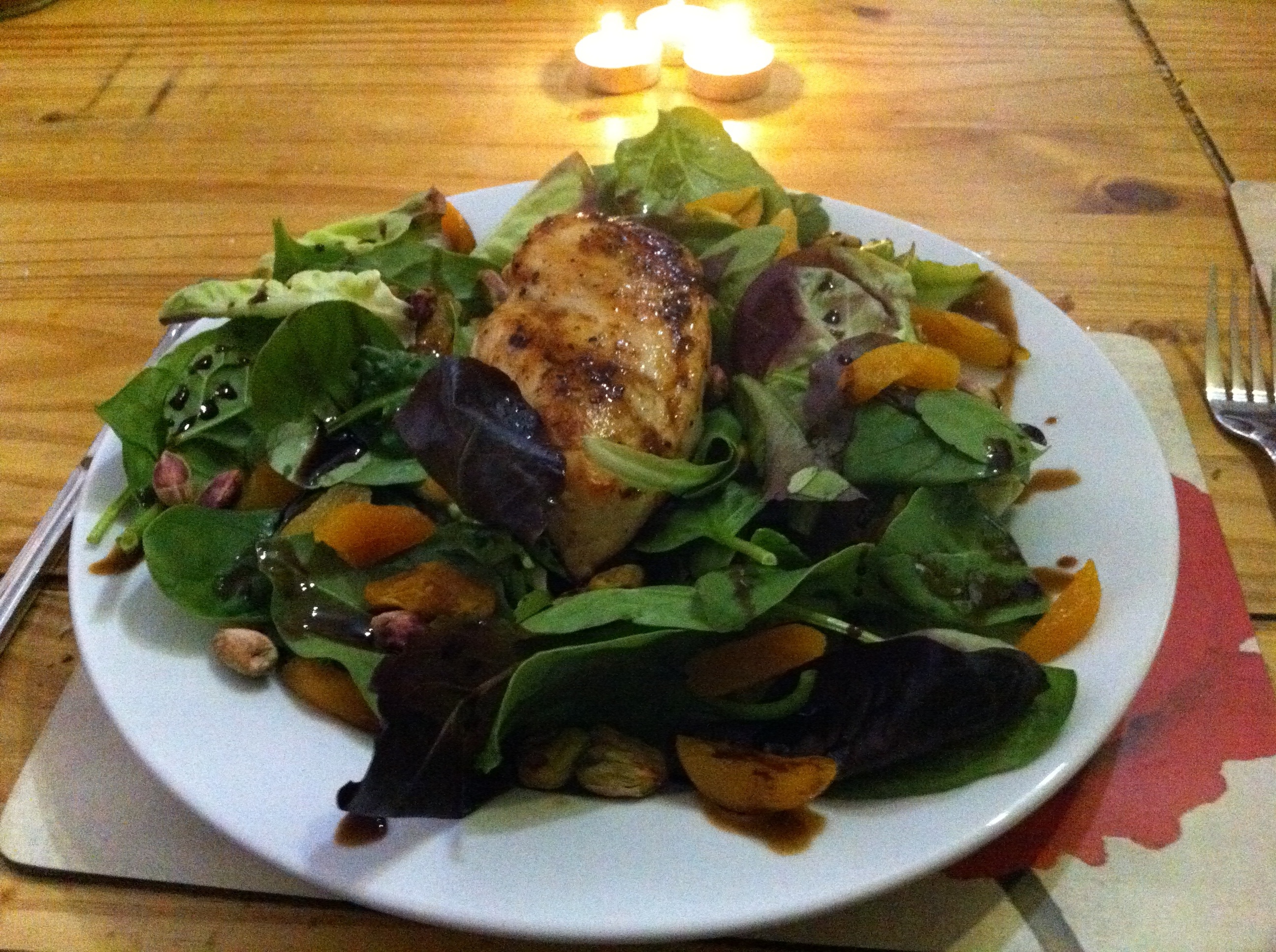 This is one of my favourite midweek meals, salad with seared chicken and a warm dressing. Fruit in savoury dishes is one of the things I love, so in winter I usually add dried fruit and toasted nuts. Today I used apricots and pistachios with a balsamic reduction – warm and comforting, but pretty healthy too.