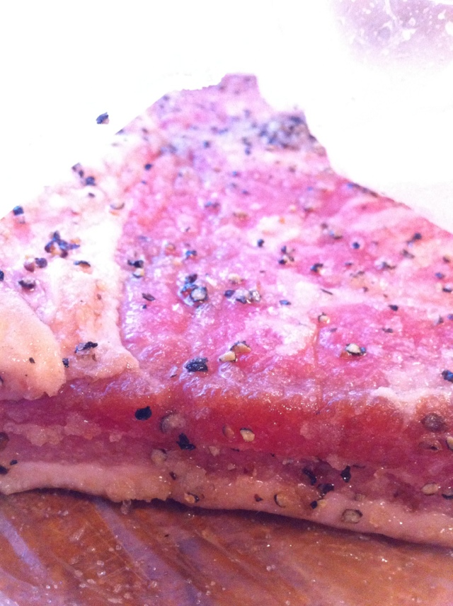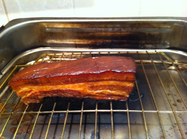 This makes it more surprising that I’ve never tried to make it myself. But, when a friend handed me a pot of sodium nitrite and said I wouldn’t look back, I decided to give it a go. I’ve had a large slab of pork belly curing in my fridge for the last week, and we unwrapped it and had some for breakfast this morning. I can honestly say it was the best bacon I’d ever eaten – better by far than the stuff from the local butcher or the farmers market, never mind the pallid, slimy wafer thin slivers that the supermarket calls bacon. It was so good that I ate every bit and completely forgot to take any post-cooking photos! So, to make up for it, I hot smoked a good chunk of it to be sliced into lardons and eaten in a salad, of which I do have some pictures. It was a real hardship….