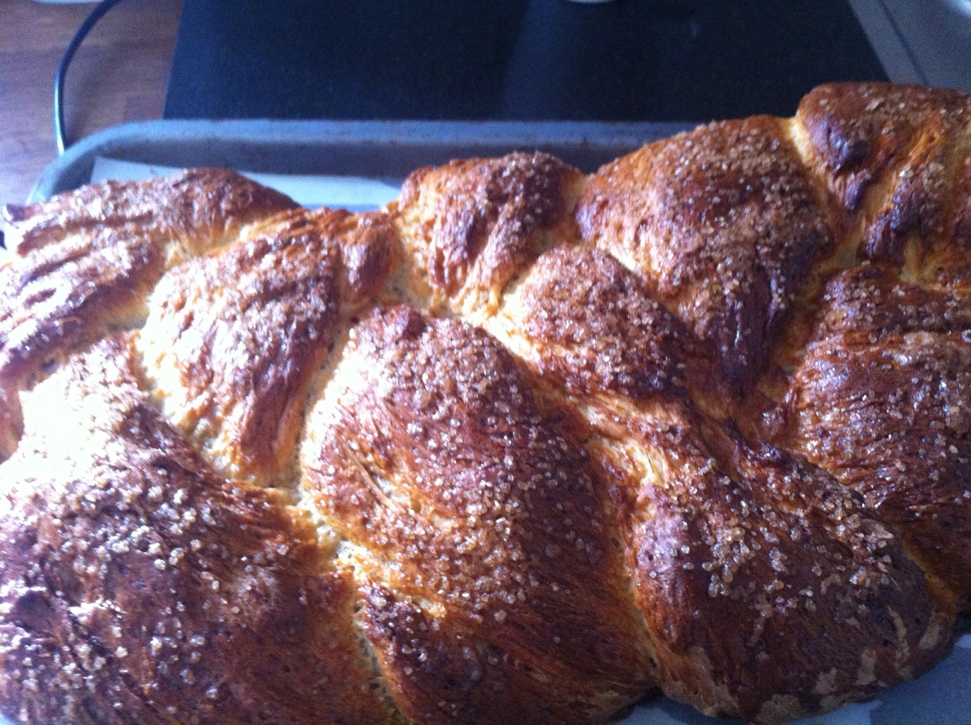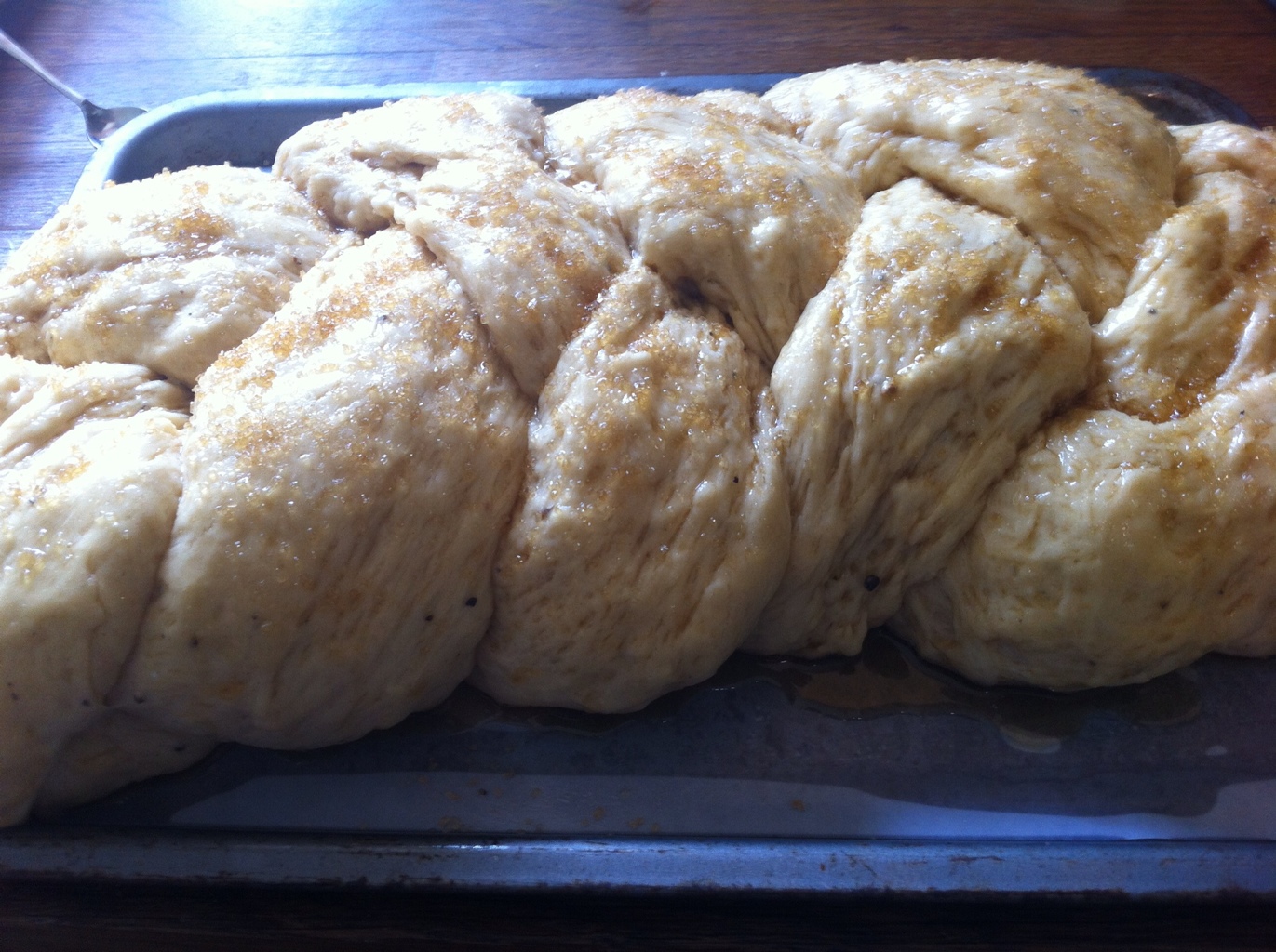Divide the dough in half. Split each half into three, and shape into long fat snakes. Squish three ends together and plait the bread. Place in a generously buttered loaf pan if you have one big enough, or just use a baking tray. Repeat for the second loaf. Cover with tea towels again and put the loaves back in a warm place to rise by half or so – this took about 40 minutes on a warm radiator.